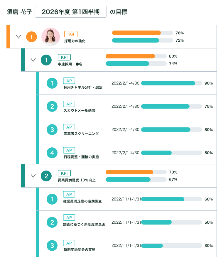 1年単位など長期で立てるのが難しい場合は、四半期・月・週ごとと、細かく分けると目標設定もしやすいです。短期・中期目標があると、進捗管理もしやすくなるでしょう。