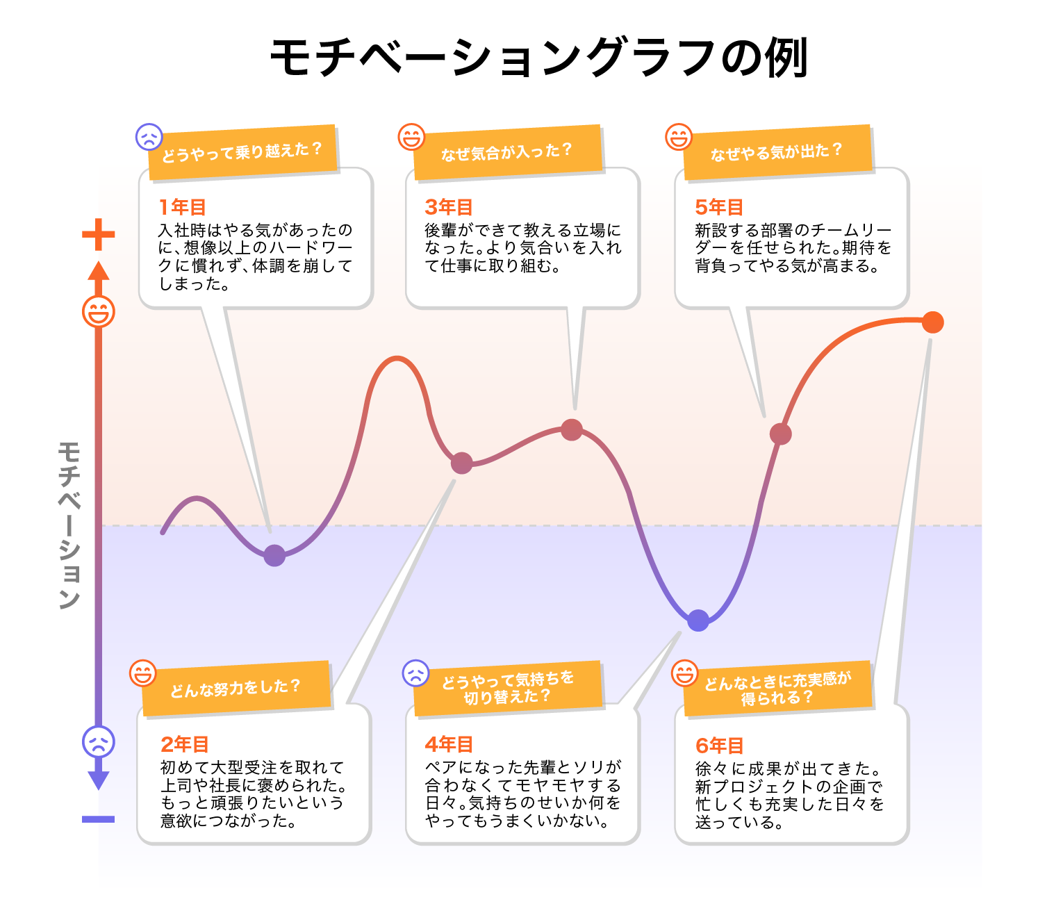 縦軸にモチベーションの高低を、横軸に期間や経験を配置し、感情の変化を表現します。さらに、モチベーションに影響を与えたできごとや思いも記録することで、個々の仕事への動機や意欲、やる気の要因を把握できるでしょう。