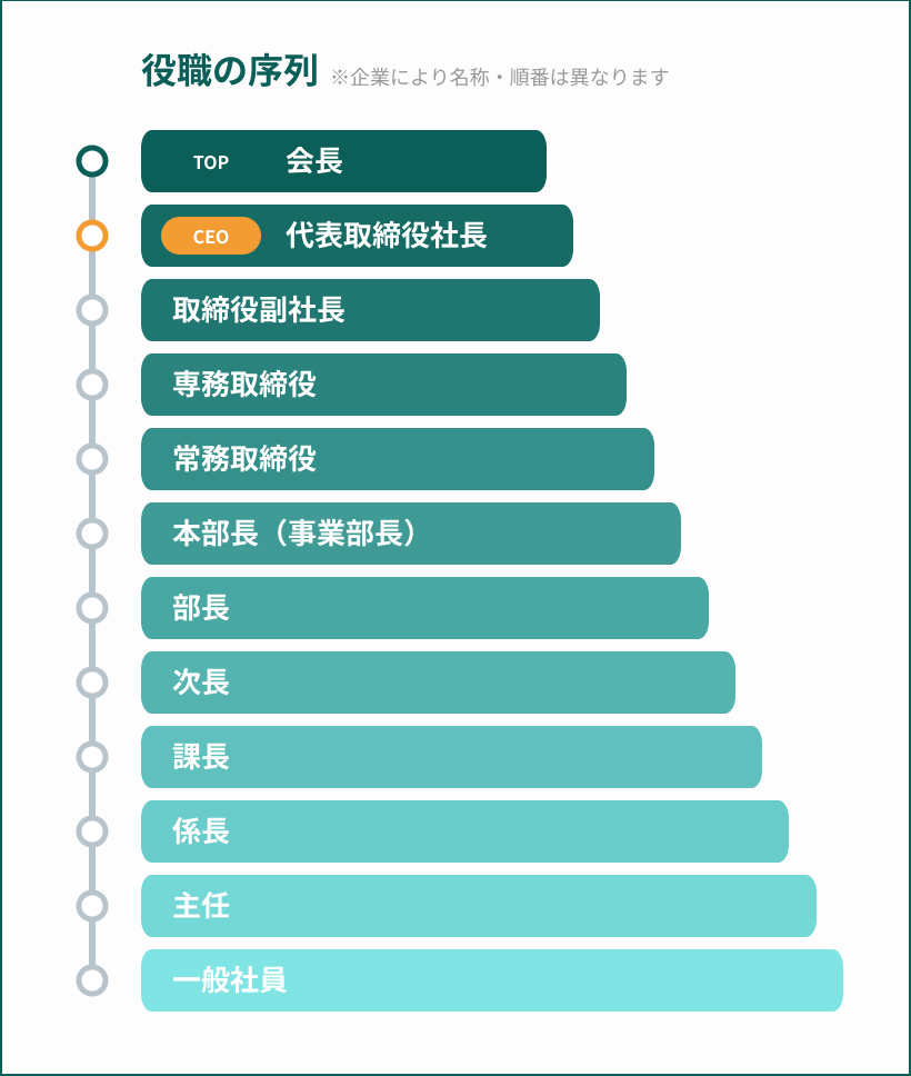 | ・Lead ・Manager ・Director ・General Manager ・Vice President ・Executive (Senior) Vice President ・CHRO ・CFO ・COO ・CEO ・President ・Chairman |