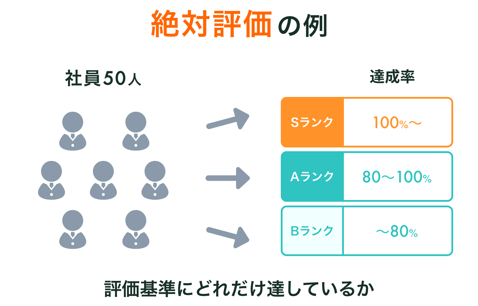 絶対評価とは、順位等にはこだわらず、目標とする基準をどれくらい満たしているかどうかで評価を行うものです。