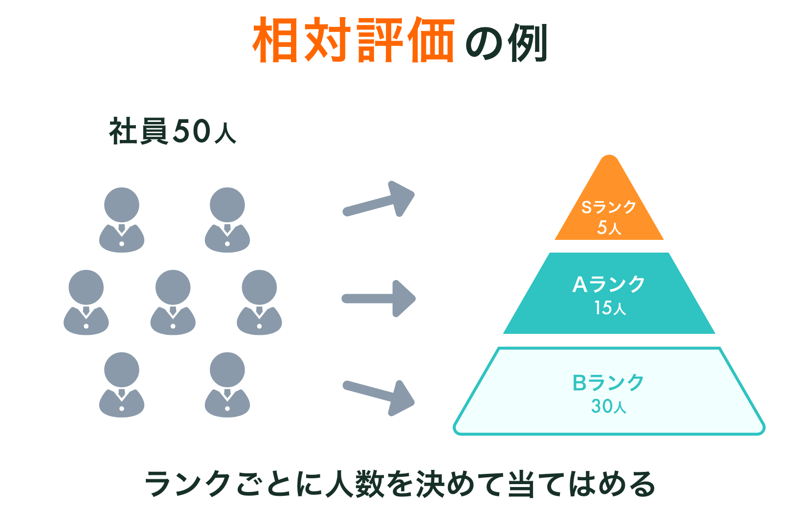 相対評価では、全体を100%となるように層や枠をあらかじめ設定したうえで、集団の一人ひとりを比較して上から順番に当てはめるように評価します。
